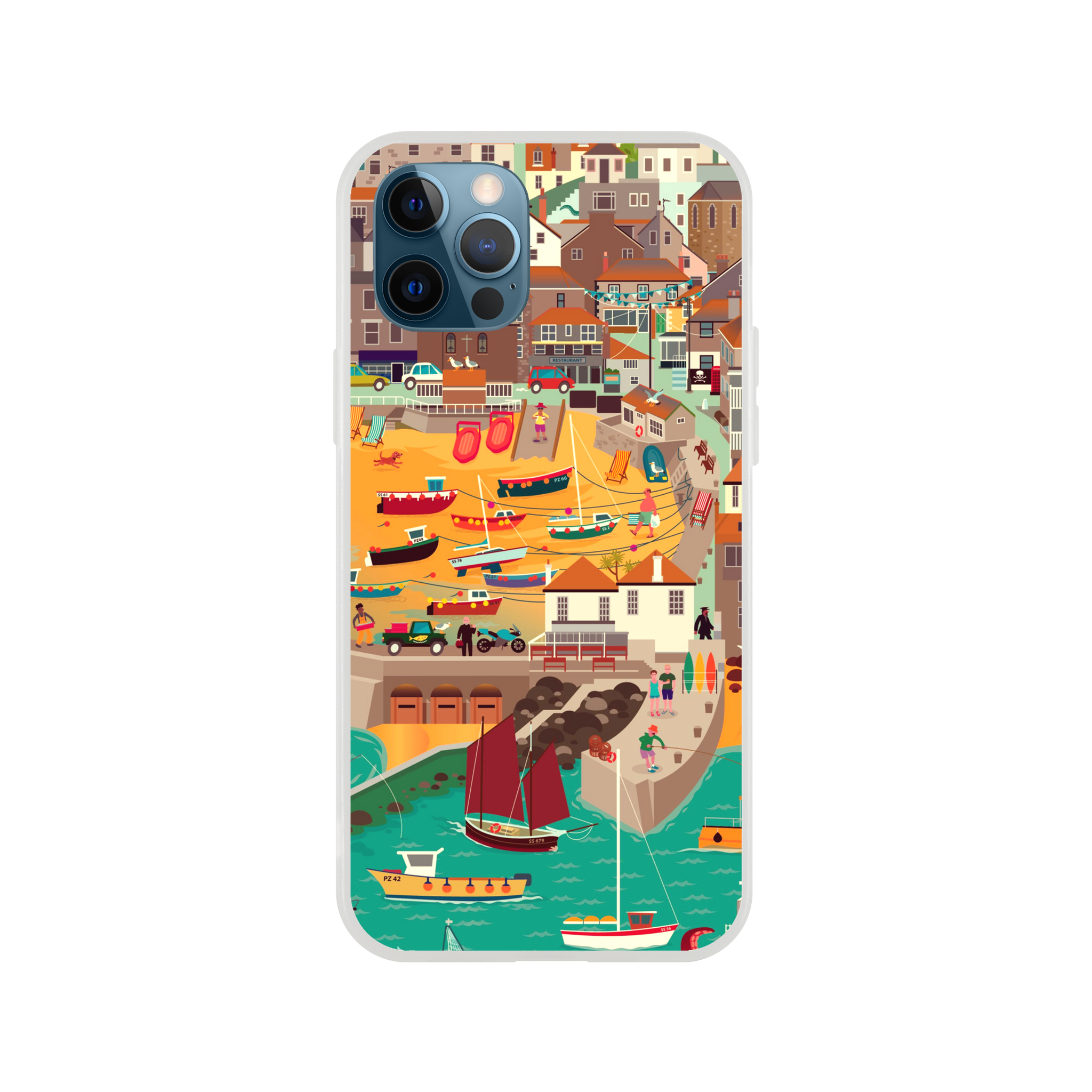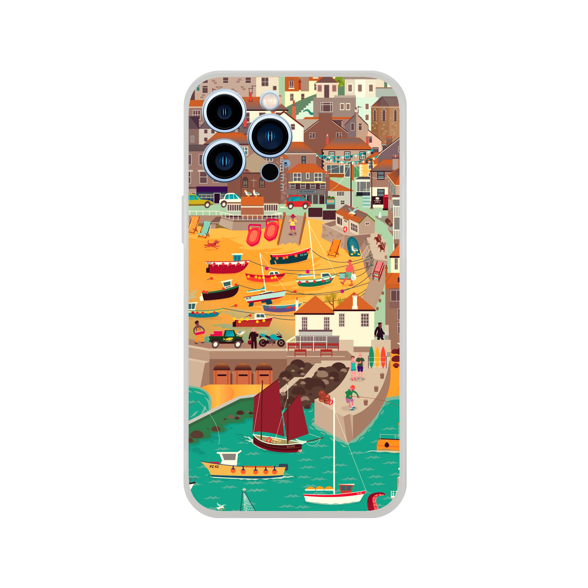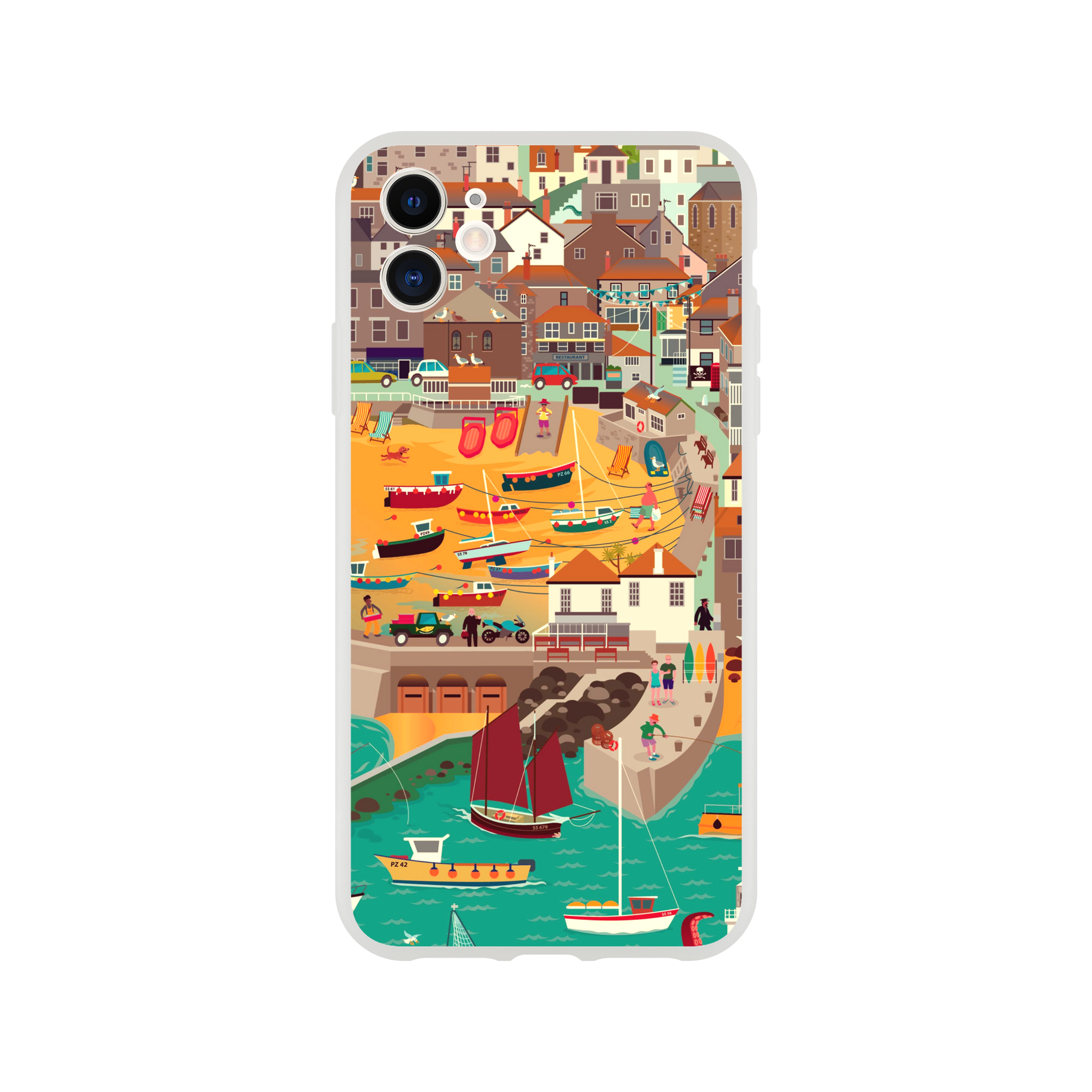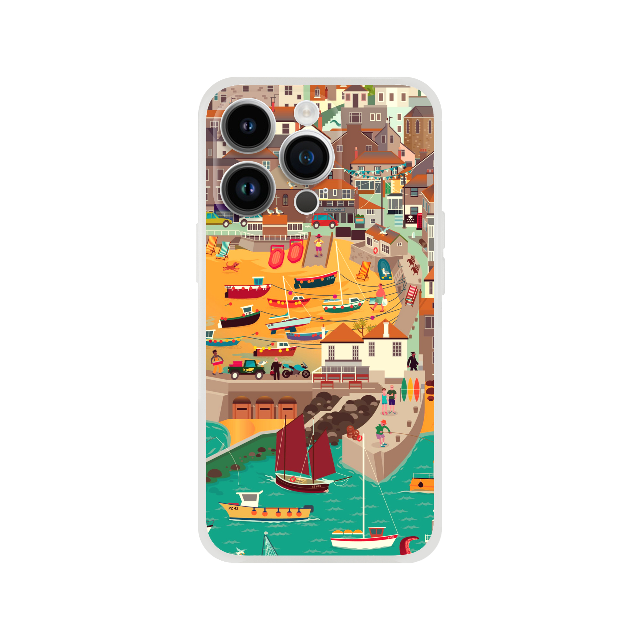 The St Ives Harbour Flexi case shows a detail from the Planet St Ives artwork. This gorgeous illustration shows the Harbour beach with boats and holidaymakers and the beautiful St Ives buildings.