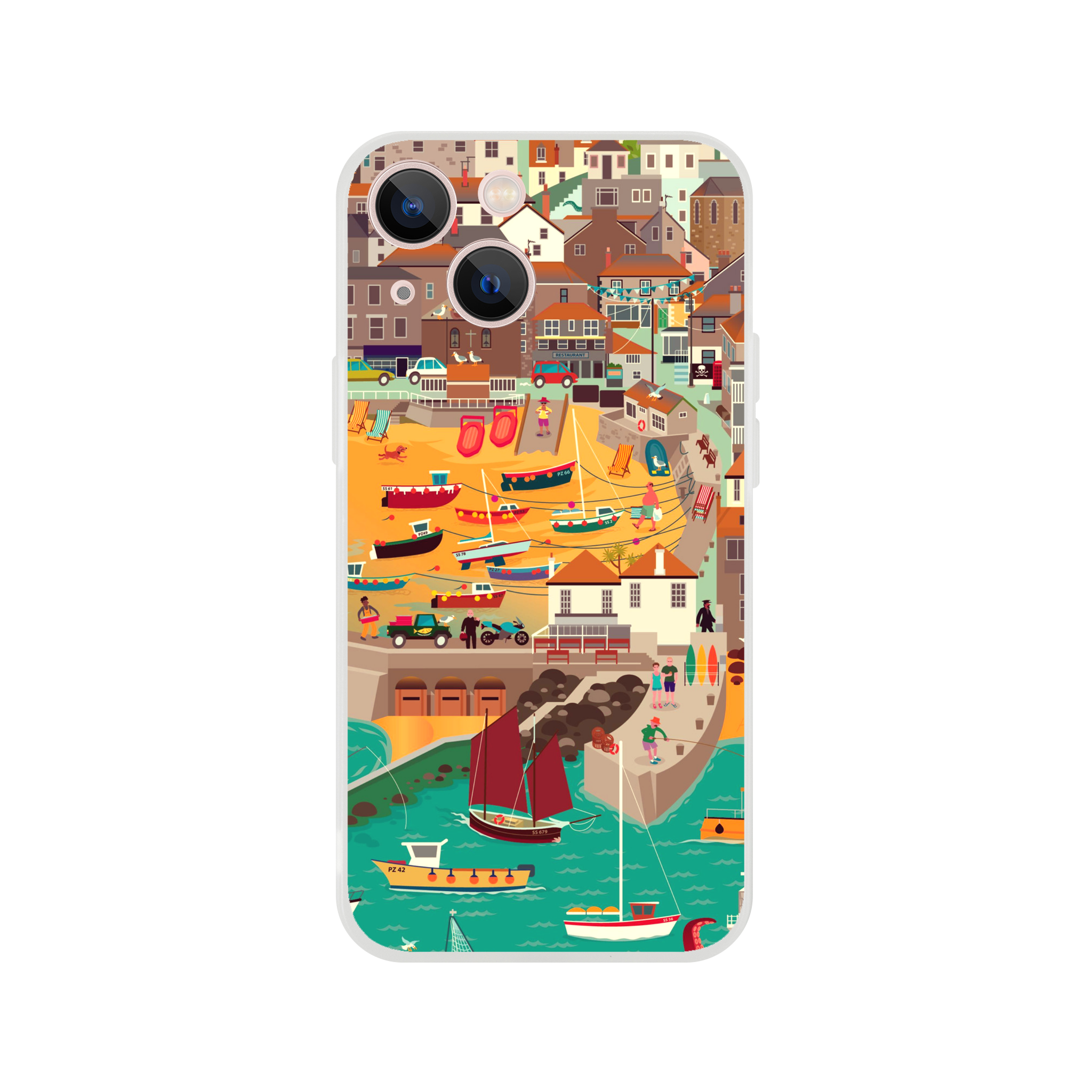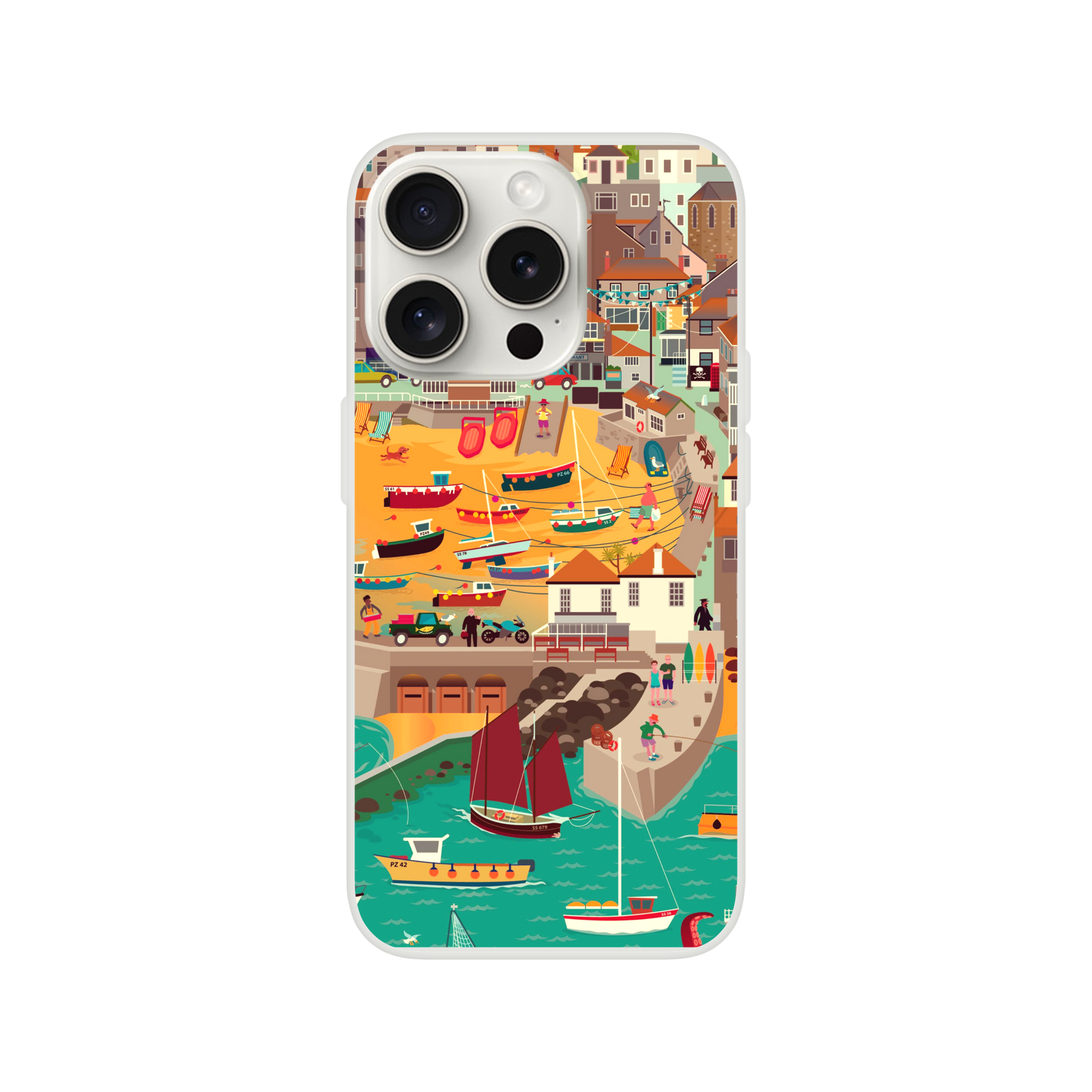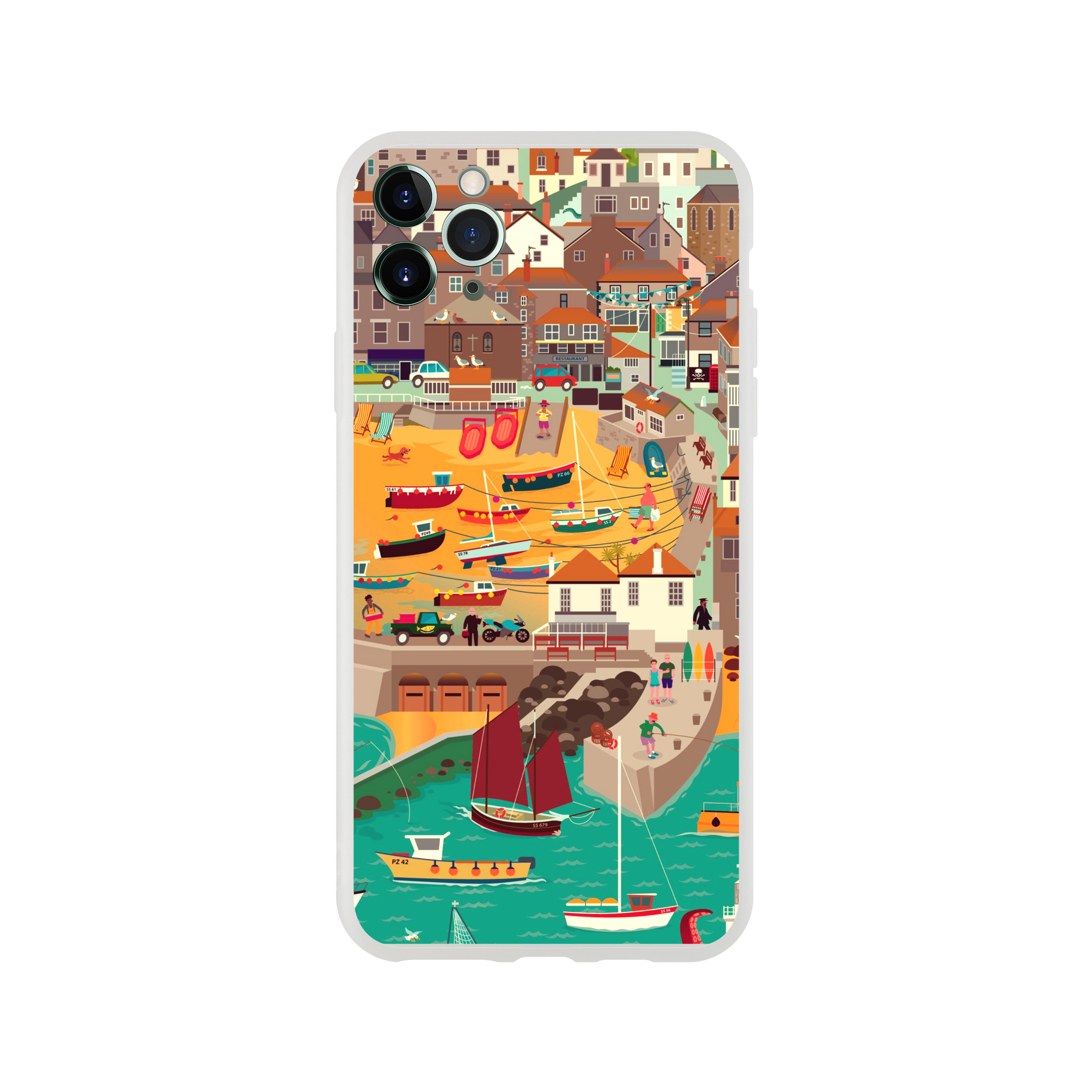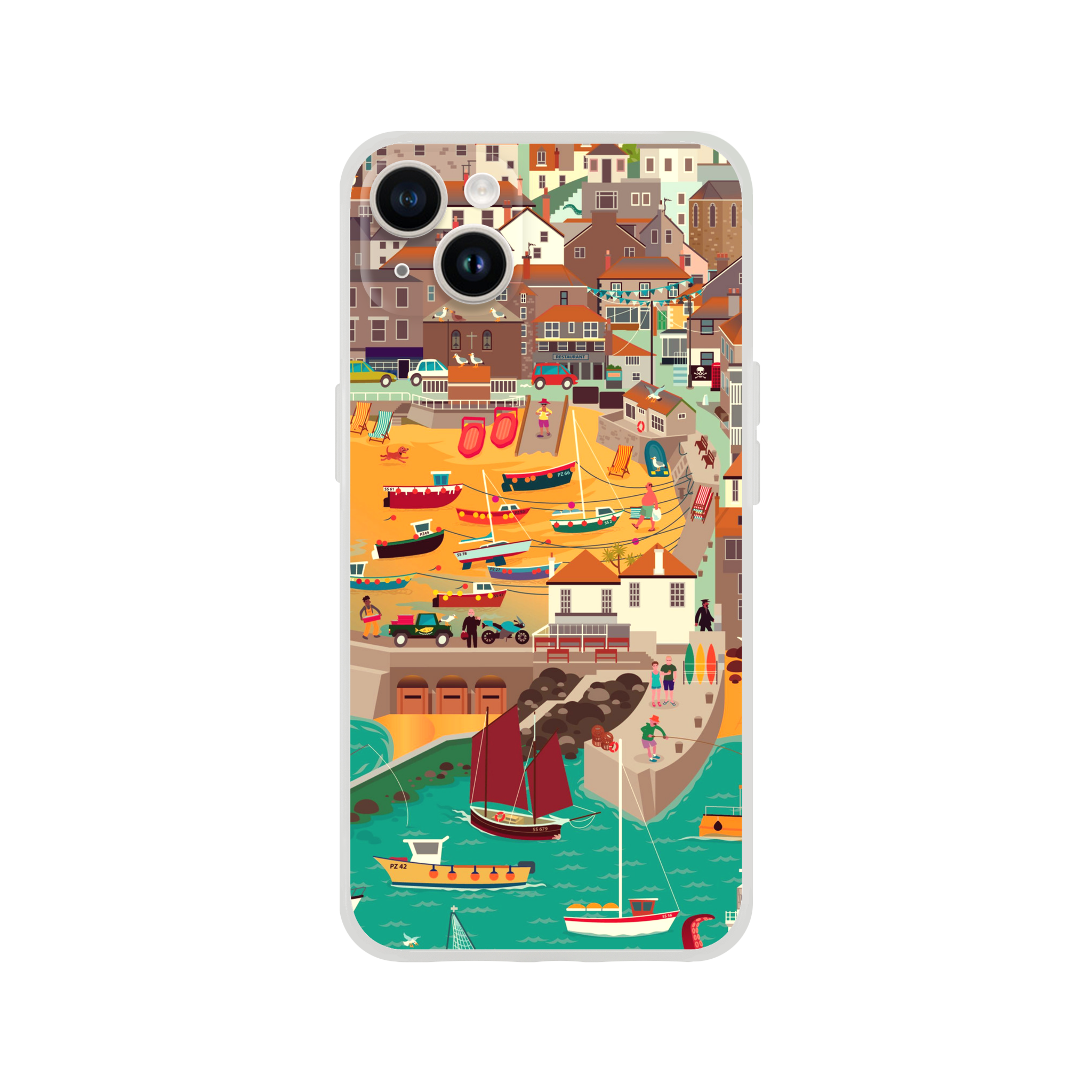 The St Ives Harbour Flexi case shows a detail from the Planet St Ives artwork. This gorgeous illustration shows the Harbour beach with boats and holidaymakers and the beautiful St Ives buildings.