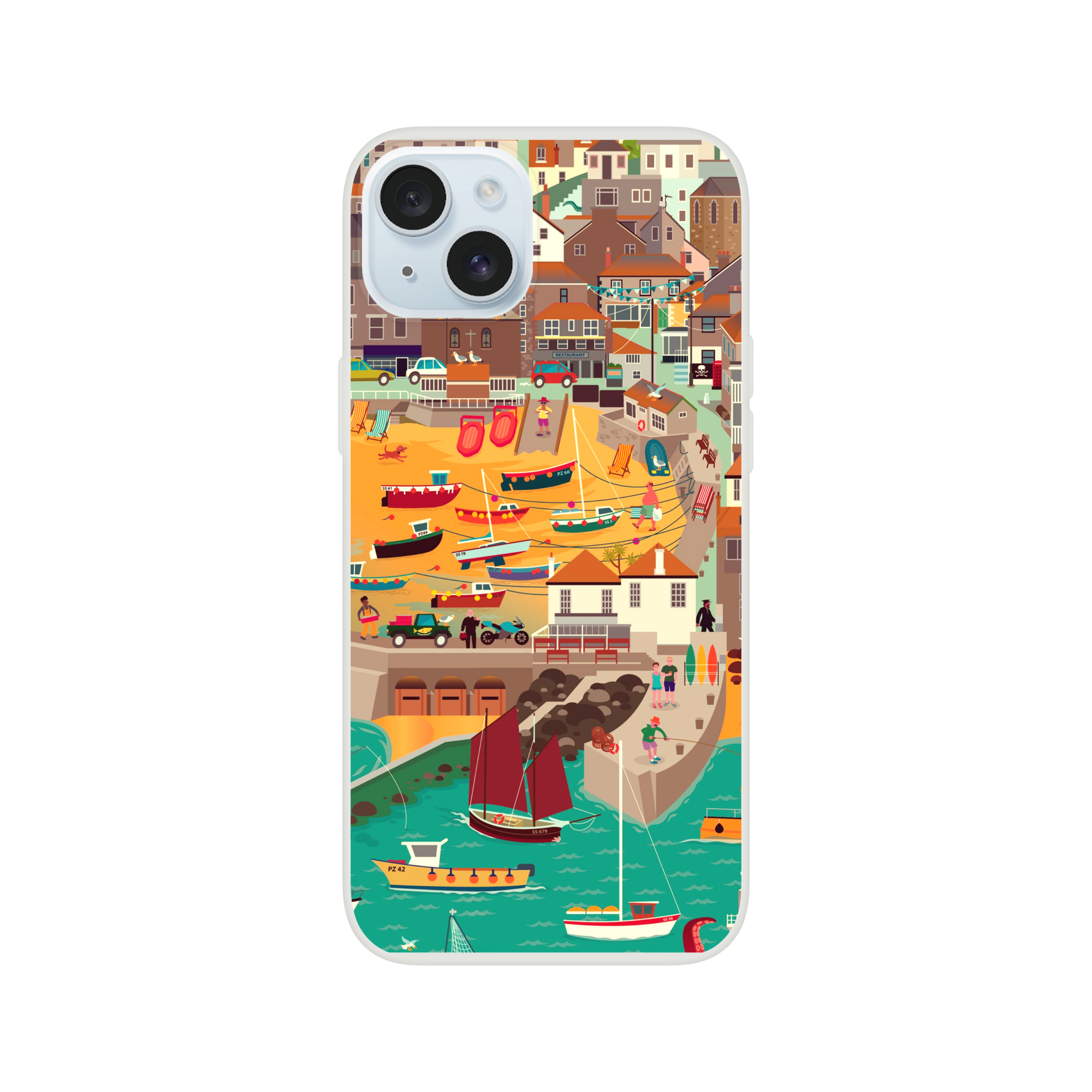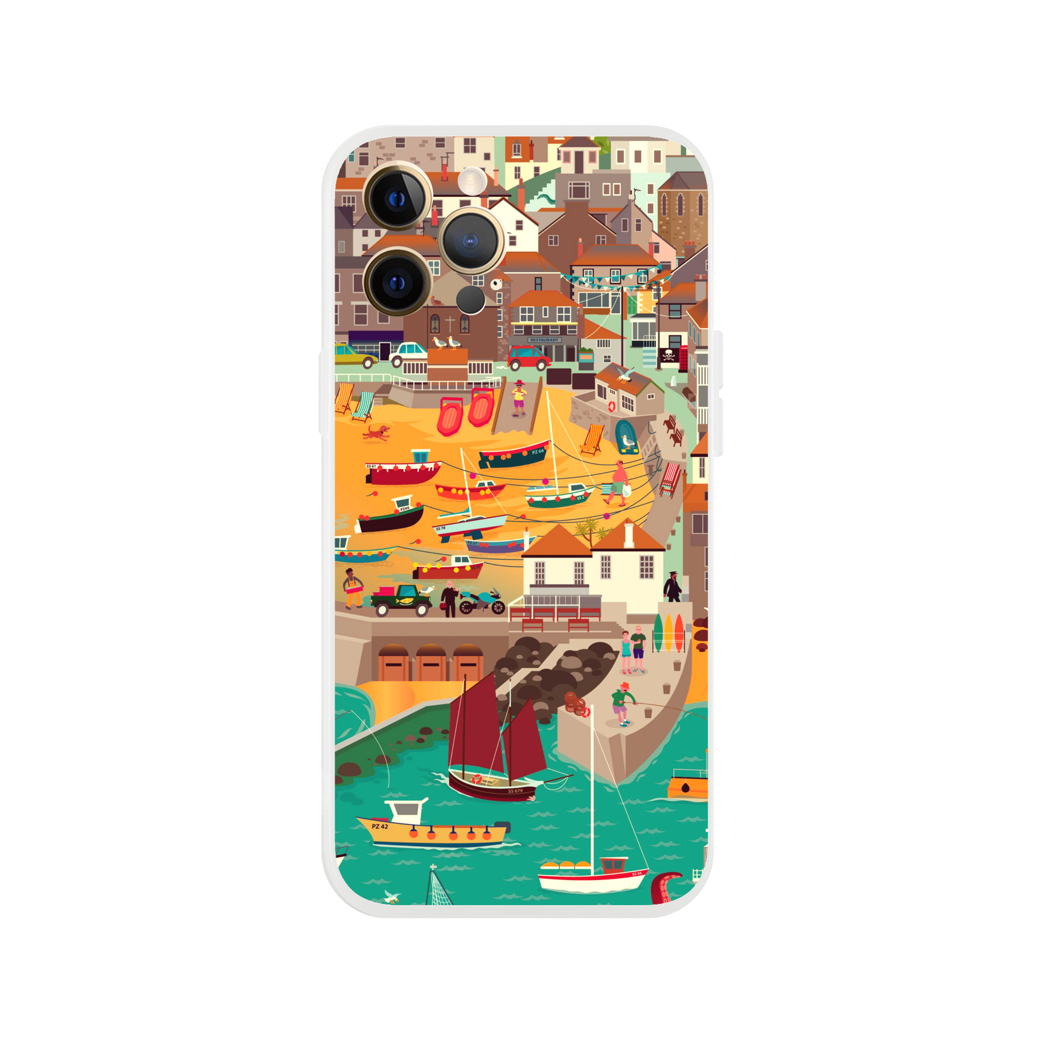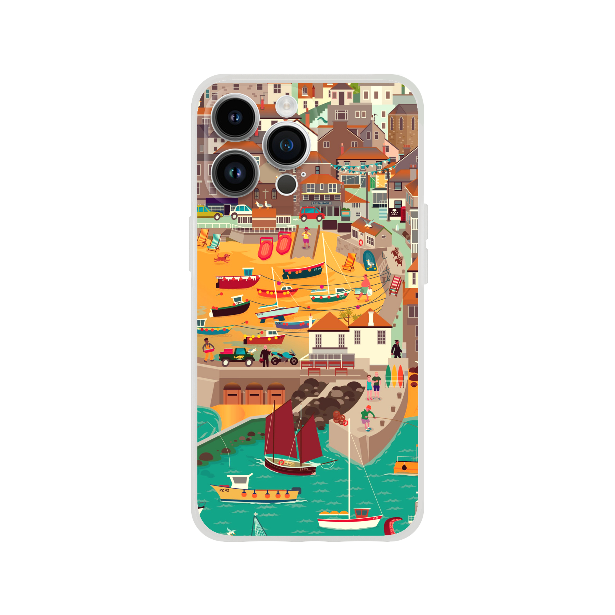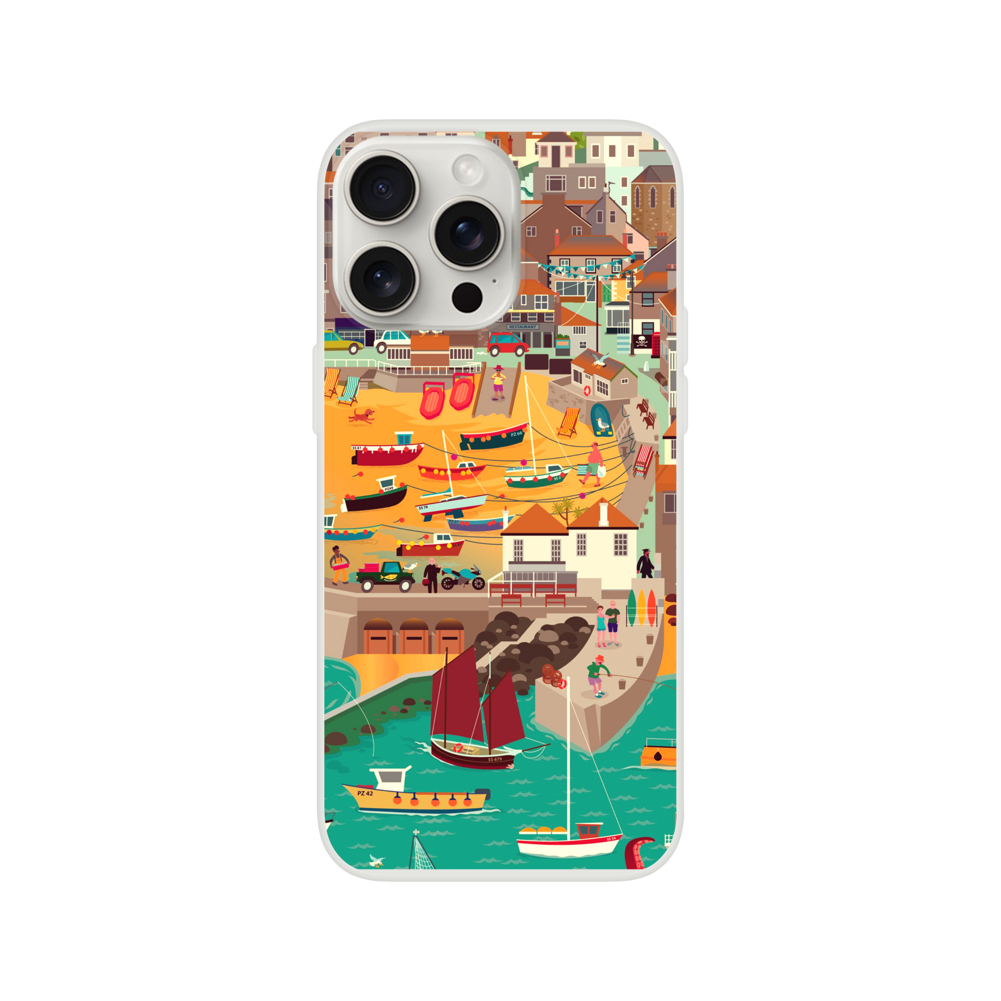 The St Ives Harbour Flexi case shows a detail from the Planet St Ives artwork. This gorgeous illustration shows the Harbour beach with boats and holidaymakers and the beautiful St Ives buildings.